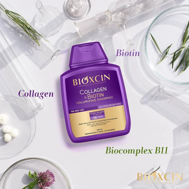 شامپو بیوکسین ضد ریزش حاوی بیوتین و کلاژن حجم 300 میل محصولی از شرکت بیوکسین BIOXCIN ترکیه است . شامپو bioxcin گیاهی ضدریزش ترمیم کننده با فرمولاسیون قدرتمند و با بهره گیری از عصاره های کاملا طبیعی و انواع ویتامین ها و مواد معدنی برای کنترل ریزش مو طراحی شده است . شامپو حجم دهنده کلاژن و بیوتین بیوکسین برای موهای نازک و ضعیف بسیار مناسب می باشد . شامپوی ضد ریزش قدرتمند بیوکسین، حاوی کلاژن هیدرولیز شده،بیوتین و پپتیدهای فعال زیستی فعال می باشد که باعث تقویت ساختار مو می باشد. وچود بیوکمپلکس B11 در ترکیبات این شامپوی بیوکسین از ریزش مو جلوگیری می کند. عدم وجود پارابن و مواد عطری و حساسیت زا در ترکیبات شامپو کلاژن بیوکسین، این شامپو را برای انواع مو و بویژه موهای حساس بسیار مناسب می باشد .
