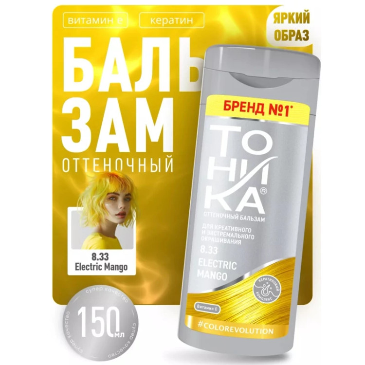 شامپو رنگ تونیکا شماره 8.33 رنگ زرد انبه ای (جیغ) رنگساژ بدون نیاز به اکسیدان می باشد. شامپو رنگ تونیکای روسی حاوی رنگدانه های بسیار غلیظ با قدرت جذب بسیار بالاست و بدون نیاز به اکسیدان بر روی موهای دکلره شده جذب شده و ماندگاری بسیار بالایی را فراهم می کند. شامپو رنگ فانتزی توهیکا بر روی موهای روشن تر از پایه 7 تنها رفله ای از رنگ ایجاد می کند و بهتری است برای دریافت نتیجه بهتر بر رویموهای دکلره شده استفاده شود.