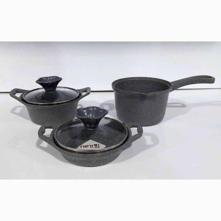 شامل یک قابلمه چدنی درب دار، تابه درب دار و شیرجوش است.