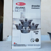 سرویس قابلمه مارک فوما تحت لیسانس ژاپن مدل fu2068 8پارچه 3عدد قابلمه و 3 عدددرب 1عددتابه دسته دار و 1 عدددرب 6عدددستگیره سیلیکونی نسوز جنس گرانیتی نچسب قابلمه سایز 28/24/20