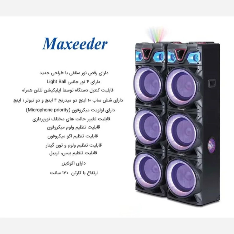 دارای شش ساب 10 اینچ دو میدرنج 4 اینچ و دو تیوتر 1 اینچ )Microphone priority دارای اولویت میکروفون قابلیت تغییر حالتهای مختلف نورپردازی قابلیت تنظیم ولوم میکروفون قابلیت تنظیم اکو میکروفون قابلیت تنظیم ولوم و تون گیتار قابلیت تنظیم بیس تریبل