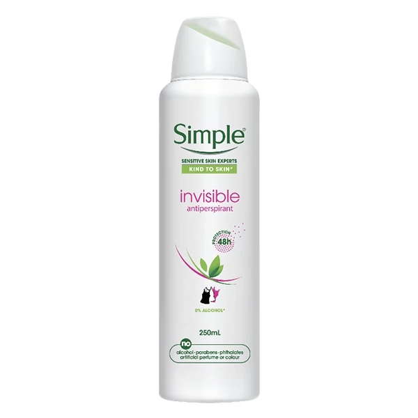 اسپری ضد تعریق سیمپل مناسب پوست حساس، محافظت 48 ساعته مدل Invisible Antiperspirant حجم 250 میل محصولی است که با تمرکز بر نیازهای پوستهای حساس طراحی شده است. این محصول از برند انگلیسی Simple، به دلیل فرمولاسیون ملایم و عدم استفاده از مواد شیمیایی تحریککننده شناخته شده است. یکی از مهمترین ویژگیهای این اسپری، محافظت ۴۸ ساعته آن در برابر تعریق و بوی نامطبوع است که بدون ایجاد رد سفید روی لباسهای تیره یا لکههای زرد روی لباسهای روشن، این کار را انجام میدهد. به همین دلیل به آن نام "نامرئی" (Invisible) داده شده است.