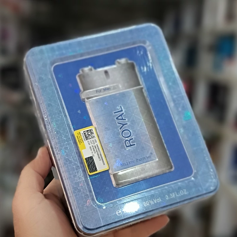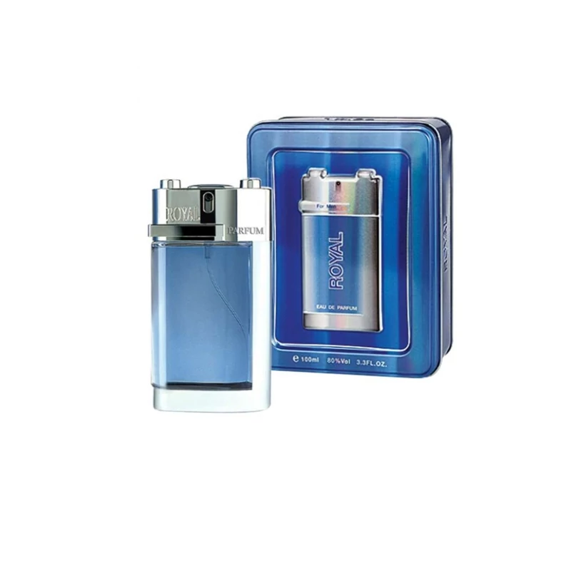عطر ادکلن رویال فلزی آبی در یک جعبه فلزی بسته بندی شده است و بطری این عطر نیز بسیار زیبا و جذاب طراحی شده است، شیشه رنگی شفاف دارد و محتویات آبی رنگ داخل آن به خوبی قابل مشاهده است یک کلاف نقره ای رنگ استیل اطراف بطری را احاطه نموده است و درپوشی از همین جنس بر روی شیشه قرار دارد که بر زیبایی این محصول افزوده است.