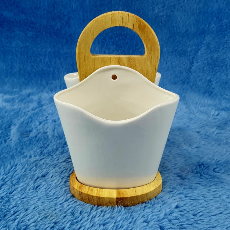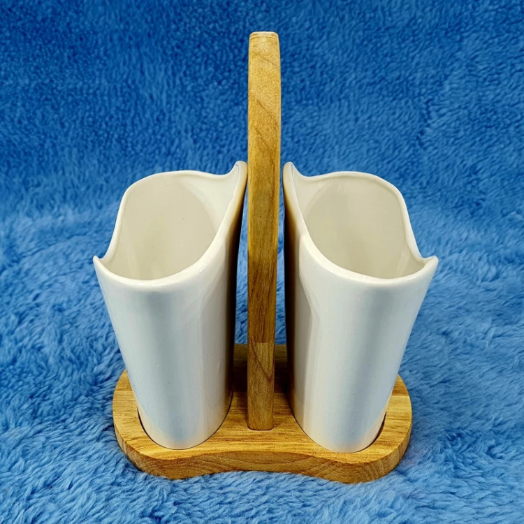 جاقاشق چنگال سرامیکی بامبو کد 2076 دارای دو ظرف استوانه ای شکل به ارتفاع 10/5 سانتی متر و قطر دهانه 12 سانتی متر می باشد. این ظرف استوانه ای شکل برای نگهداری چاقو، کفگیر و قاشق و چنگال مورد استفاده قرار می گیرد. این محصول در کنار ظروف غذا خوری بر روی میز پذیرائی شما جلوه خاصی را برای بیننده ایجاد می کند. جاقاشق چنگالی از جنس سرامیک بوده که از استحکام بسیار بالایی برخوردار می باشد. این جا قاشق چنگال دارای یک استند از چوب بامبو می باشد که زیبایی محصول را دو چندان نموده است.