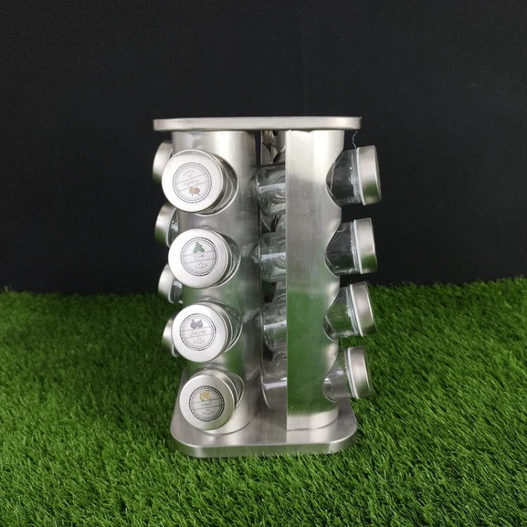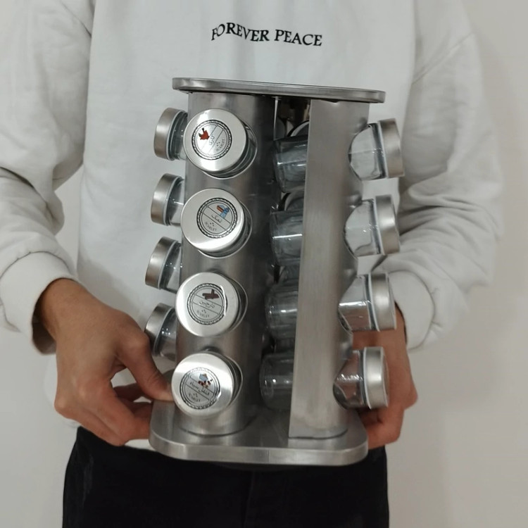 آشپزخانه ادویه گردان از جنس استنلس استیل 16 شیشه ای برای میز آشپزخانه تقویت کنید. این قفسه چرخان ادویه ساخته شده از فولاد ضد زنگ، 16 شیشه را در خود جای می دهد که پر از ادویه جات پر مصرف است. کوزه های موجود در سازمان دهنده ادویه ها از شیشه با درپوش های سفیددارای رویه های الک تر برای پخش آسان و بدون آشفتگی هنگام چاشنی غذا هستند. ادویه های موجود در قفسه ادویه شما ممکن است شامل ریحان، مرزنجوش، نمک سیر، گشنیز، رزماری، پونه کوهی و غیره باشد.