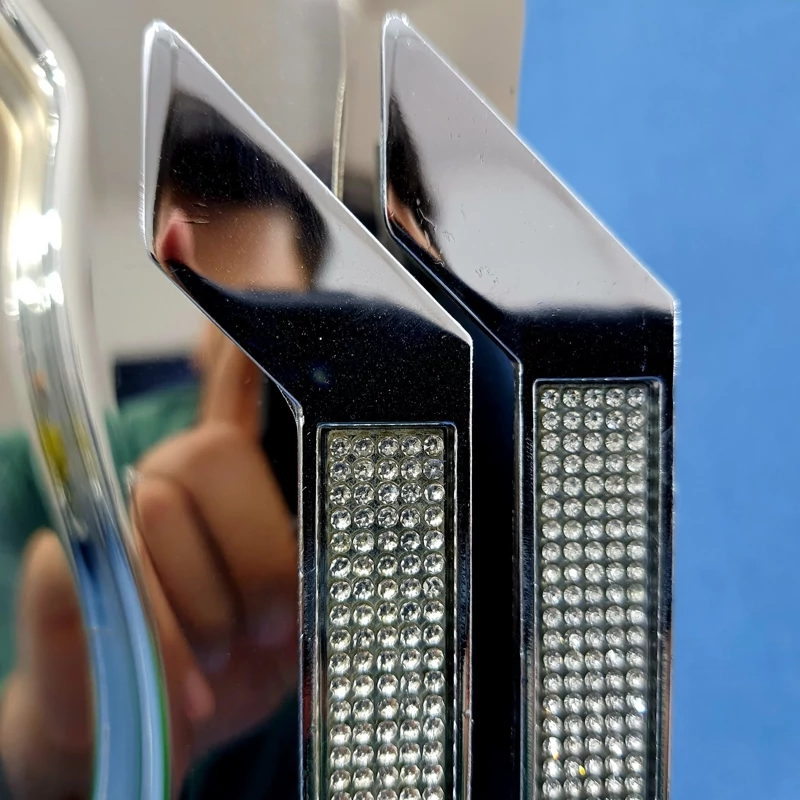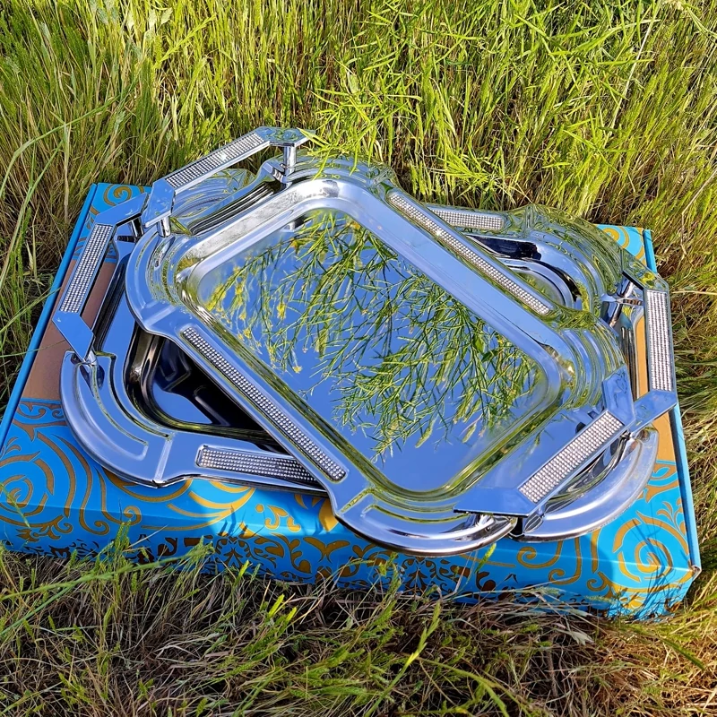 روی لبه ی سینی با نگین های شیشه ای کار شده که جلوه ی بسیار زیبایی به سینی بخشیده