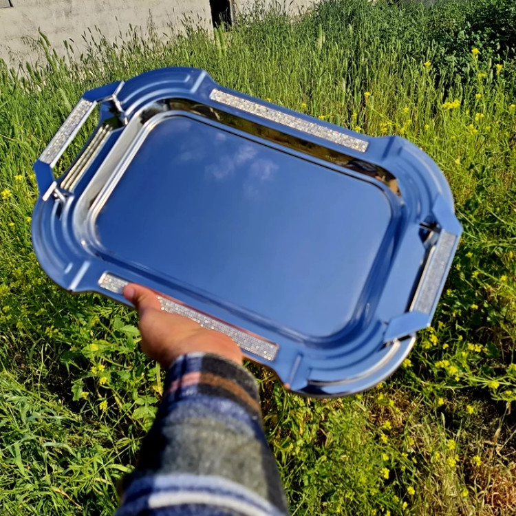 روی لبه ی سینی با نگین های شیشه ای کار شده که جلوه ی بسیار زیبایی به سینی بخشیده