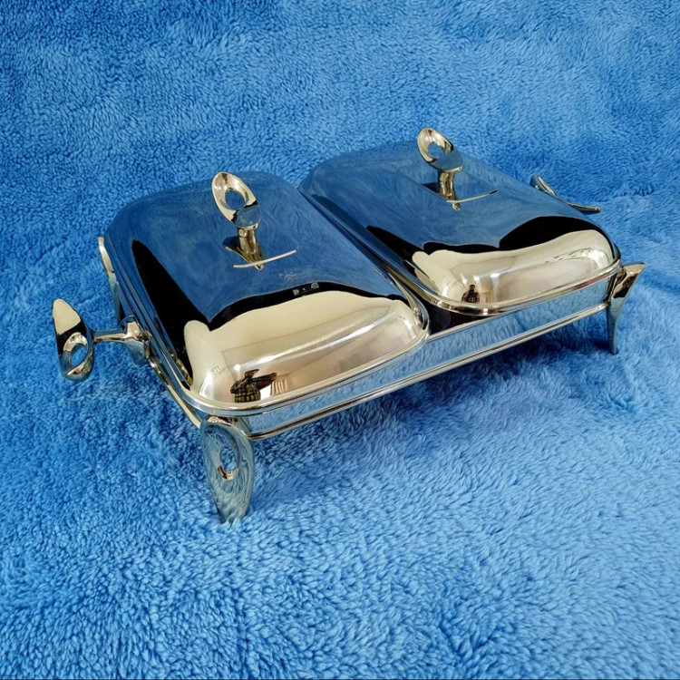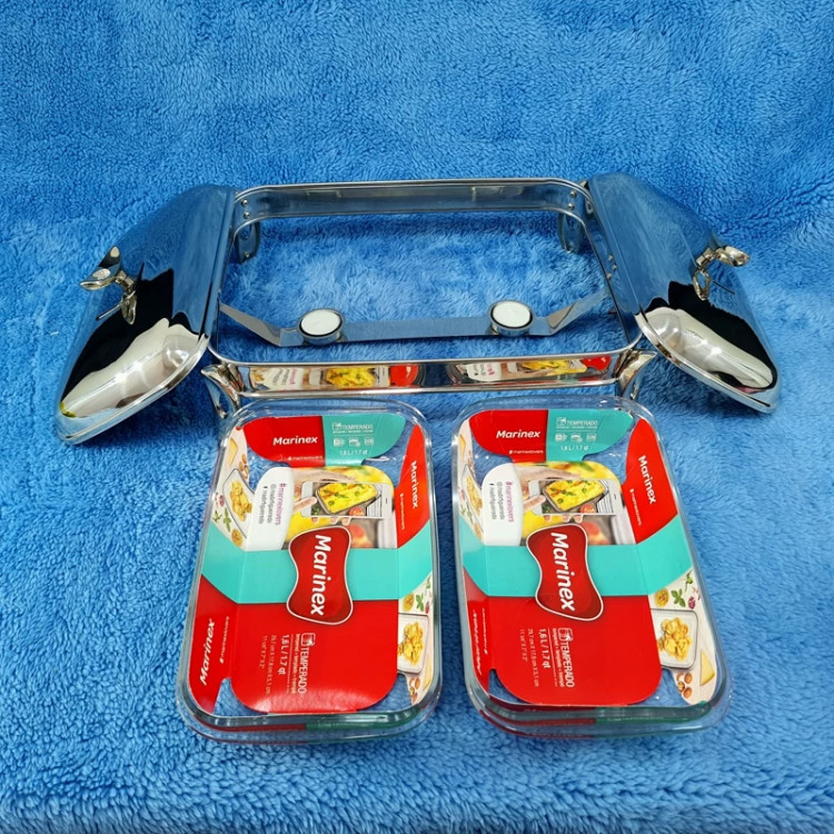 سوفله خوری دوقلوی مستطیل برند safinox مدل فلیم براق کد 700 تولید شده با ورق استیل ضخیم و ضد زنگ 18٫10 با پایه و دسته هایی از جنس زاماک آبکاری شده و براق و 2 عدد ظرف پیرکس مارینکس برزیلی 30×18 سانت 1٫6 لیتری که در مقابل شوک حرارتی و ضربه ای مقاوم است و قابلیت قرارگیری در فر و مایکروویو و ماشین ظرفشویی را دارد تولید شده