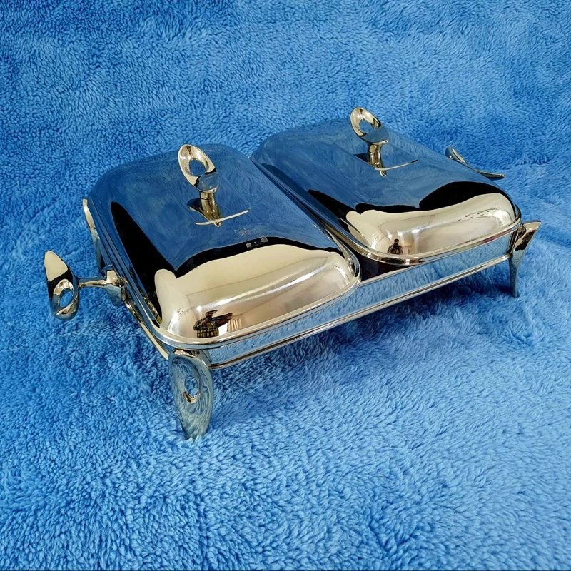 سوفله خوری دوقلوی مستطیل برند safinox مدل فلیم براق کد 700 تولید شده با ورق استیل ضخیم و ضد زنگ 18٫10 با پایه و دسته هایی از جنس زاماک آبکاری شده و براق و 2 عدد ظرف پیرکس مارینکس برزیلی 30×18 سانت 1٫6 لیتری که در مقابل شوک حرارتی و ضربه ای مقاوم است و قابلیت قرارگیری در فر و مایکروویو و ماشین ظرفشویی را دارد تولید شده
