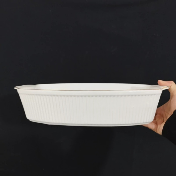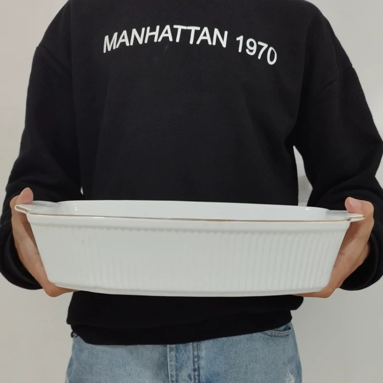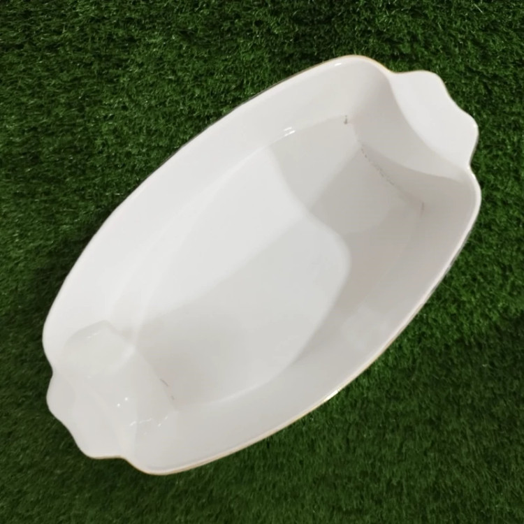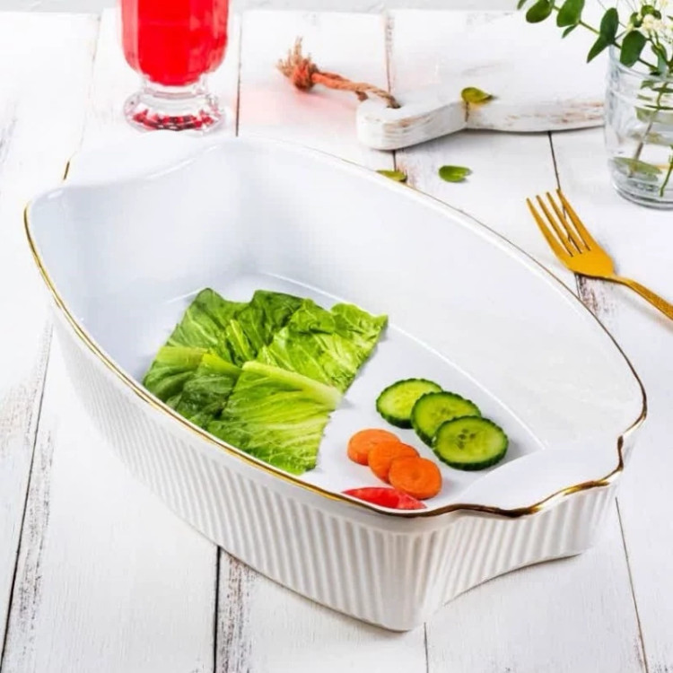 تابه مستطیل لب طلا سرامیکی مدل ماهور از جذاب ترین وسیله هایی است که در میهمانی می توانید به عنوان ظرف پذیرایی استفاده کنید. این محصول از جنس و با لعابی سفید رنگ پوشیده است. شما می توانید از این تابه رابرای سرو غذا استفاده کنید.