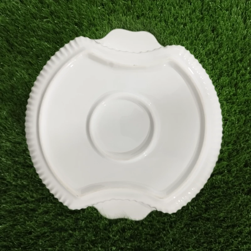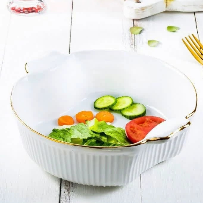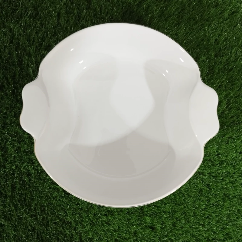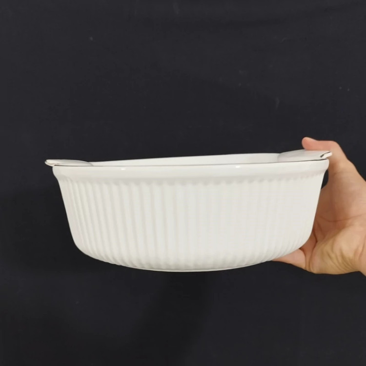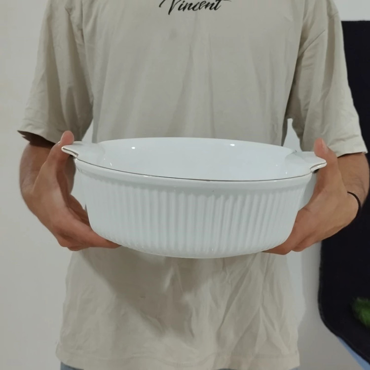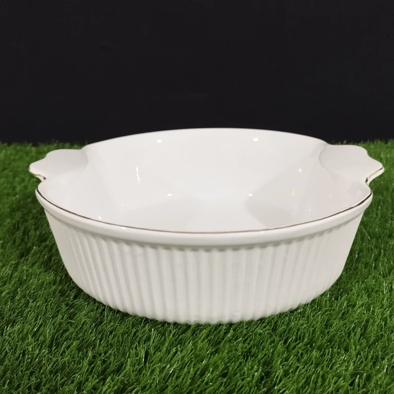 تابه گرد لب طلا سرامیکی مدل شیاردار از جذاب ترین وسیله هایی است که در میهمانی می توانید به عنوان ظرف پذیرایی استفاده کنید. این محصول از جنس و با لعابی سفید رنگ پوشیده است. شما می توانید از این تابه رابرای سرو غذا استفاده کنید.
