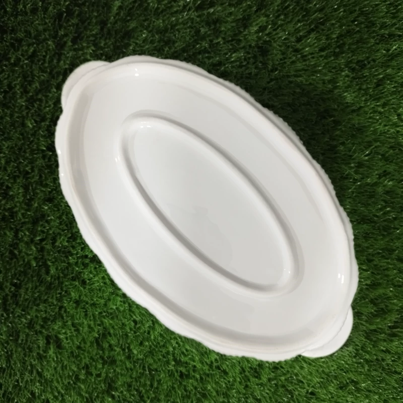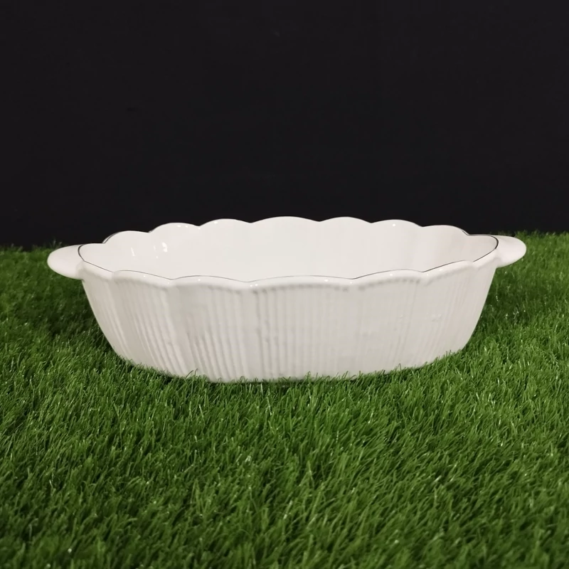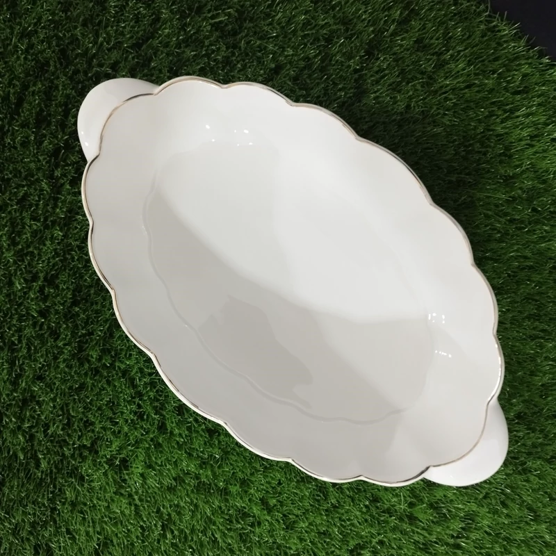 تابه بیضی لب طلا سرامیکی مدل ابری از جذاب ترین وسیله هایی است که در میهمانی می توانید به عنوان ظرف پذیرایی استفاده کنید. این محصول از جنس و با لعابی سفید رنگ پوشیده است. شما می توانید از این تابه رابرای سرو غذا استفاده کنید.