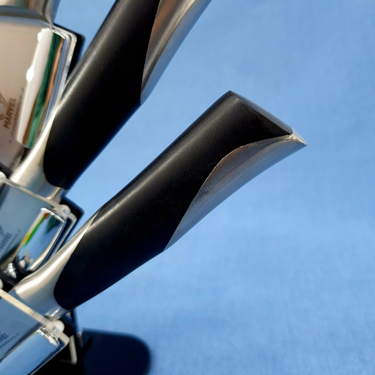 رنگ این سرویس ثابت، ماندگار و با کیفیت بالا میباشد؛ سرویس کارد و ساطور مارول شامل یک چاقوی بزرگ، ساطور، پایه نگهدارنده، چاقو تیزکن، چاقوی سایز 2،3 و 4، قیچی برش برای گوشت، مرغ و ماهی است.