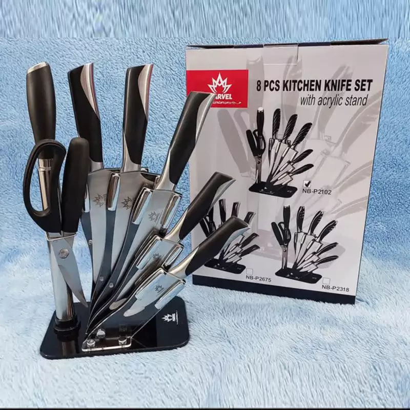 سرویس کارد و ساطور مارول 8 پارچه از جنس تیغه استیل ضد زنگ میباشد