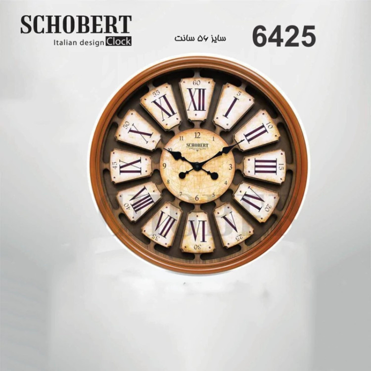 ساعت چوبی شوبرت مدل 6425 با موتور آرام گرد و بی صدای تایلندی و طراحی خاص ایتالیایی در سایز 58 سانت در کشور چین تولید شده