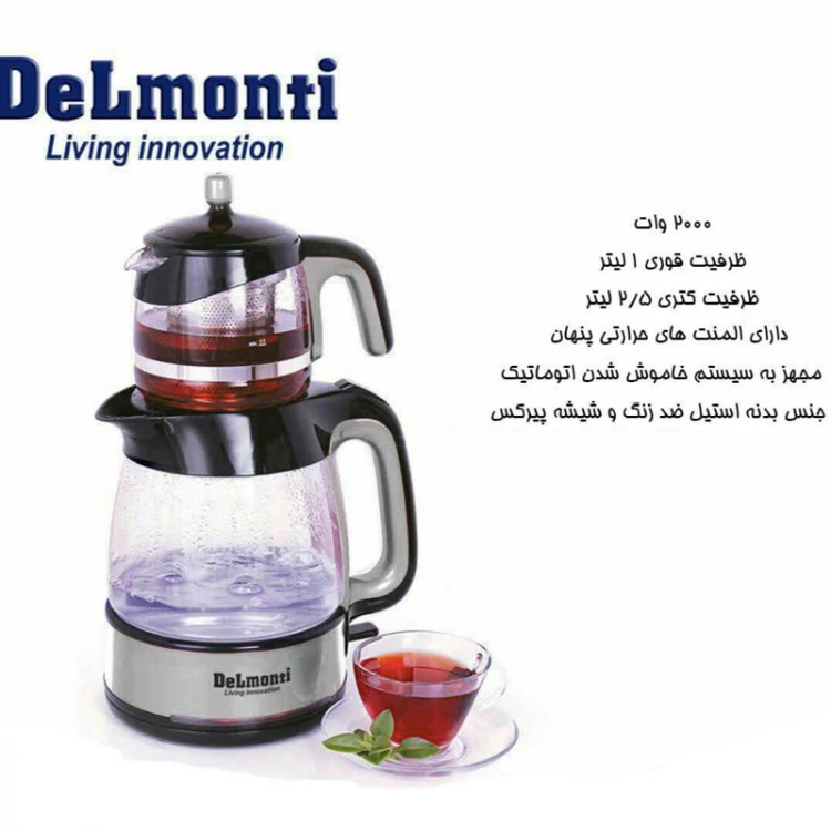 چای ساز پیرکس دلمونتی مدل DL400 از جدیدترین محصولات دلمونتی است. این چای سازاز دو بخش کتری و قوری تشکیل شده است. کتری و قوری با ظرفیت های مناسب و دستگاه دارای عملکرد گرم نگه داشتن اتوماتیک می باشد.ظرفیت کتری چای ساز در حدود 2.5 لیتر بوده و ظرفیت قوری آن در حدود 1 لیتر است و مناسب خانواده های پرجمعیت و کم جمعیت می باشد. قوری چای ساز دلمونتی مدل Dl400 از جنس شیشه میباشد که این امکان را به شما میدهد که رنگ چای دم کشیده را به راحتی تشخیص دهید، این قوری مقاوم در برابر حرارت است همچنین مجهز به فیلتر تمام استیل میباشد و کتری آن بر روی پایه دارای قابلیت چرخش 360 درجه است.