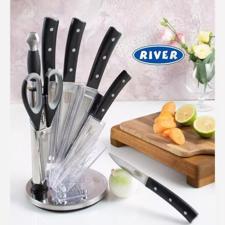 سرویس کارد و ساطور ریور کد 2236 با بدنه تمام استیل ضد زنگ و تیغه و دستگیره یک تکه رضایت خریداران بسیاری را به سمت خود جلب کرده است. این ست 8 پارچه شامل 4 عدد چاقو در سایز و کاربردهای مختلف، 1 عدد ساطور، 1 عدد قیچی آشپزی و 1 عدد سوهان مخصوص تیز کردن چاقوها می باشد که بر روی یک استند چرخان قرار می گیرند.