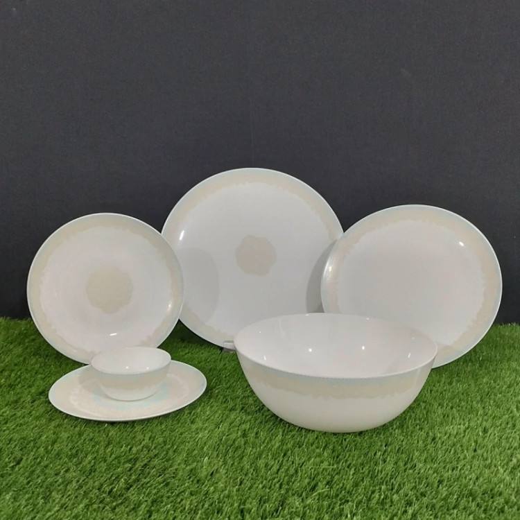 سرویس آرکوپال 26 پارچه مدل گرد جانا کرم فیروزه یک سرویس آرکوپال تولید ایران می باشد که با یک قالب جدید در طرح و نقشی بسیار زیبا به سبک سرویس های اوپال اسپانیایی تولید شده این ظروف قابلیت تحمل دمای بالایی را دارند به همین دلیل قابلیت قرارگیری در مایکروویو را دارا می باشند همچنین این ظروف قابلیت شستشو در ماشین ظرفشویی را نیز دارند این سرویس شامل: 6 عدد بشقاب تخت برنج خوری 6 عدد بشقاب گود خورش خوری 6 عدد پیش دستی دسر خوری 6 عدد پیاله ماست خوری 1 عدد دیس 1 عدد کاسه سالاد بزرگ می باشد که در یک بسته بندی بسیار زیبا و با دوام قرار میگیرد