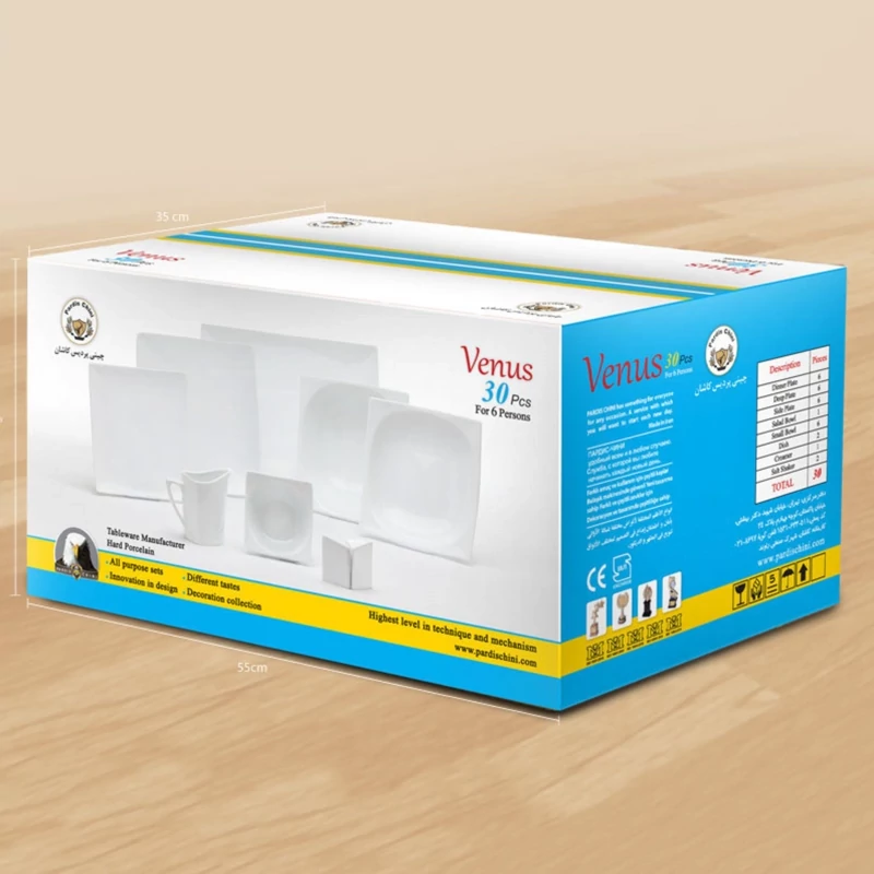 این سرویس با طرح و قالبی بسیار زیبا توسط کارخانه ی چینی پردیس کاشان تولید شده و در یک بسته بندی فوق العاده شیک و مطمئن قرار دارد تا برای جابجایی ها نیز دچار آسیب نشود این سرویس ها گزینه مناسبی برای کسانی است ک ب پذیرایی مجلل و شیک از مهمان و ست بودن ظروف اهمیت می دهند
