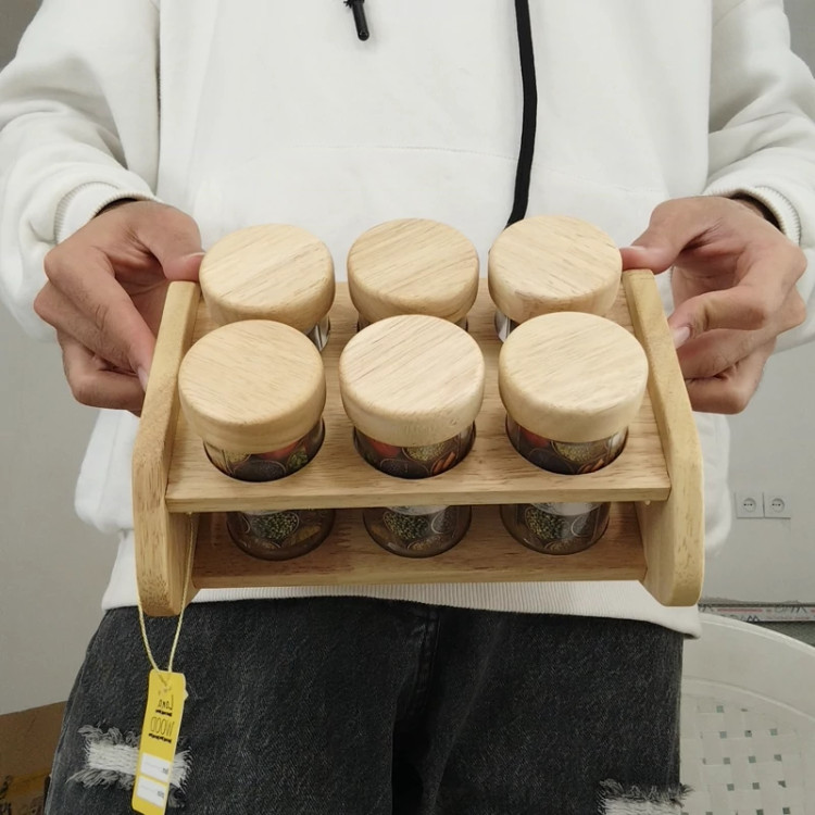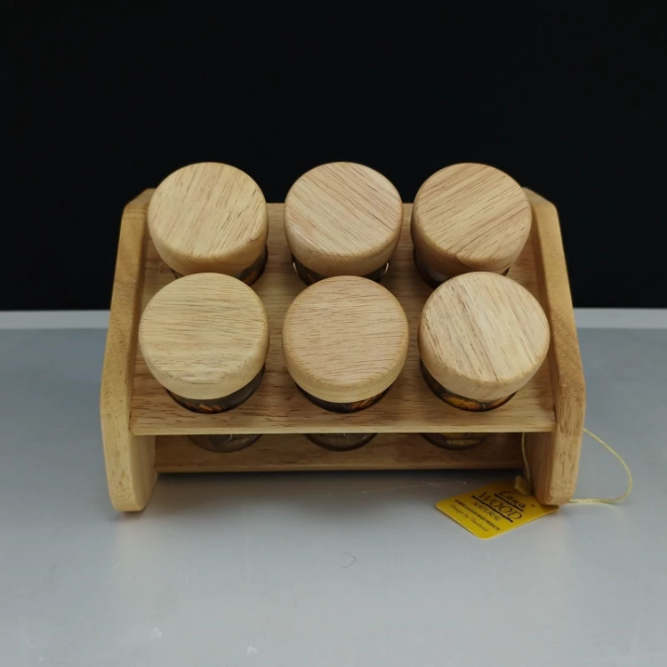 سرویس ادویه 6 تایی 99063 شامل 6 عدد ظرف ادویه درب چوبی است این ظرف های ادویه همگی به شکل پاششی هستند و بر روی پایه چوبی مستطیل قرار می گیرند.