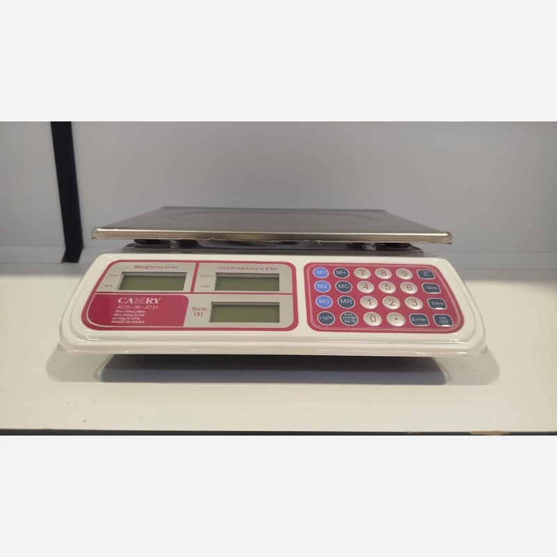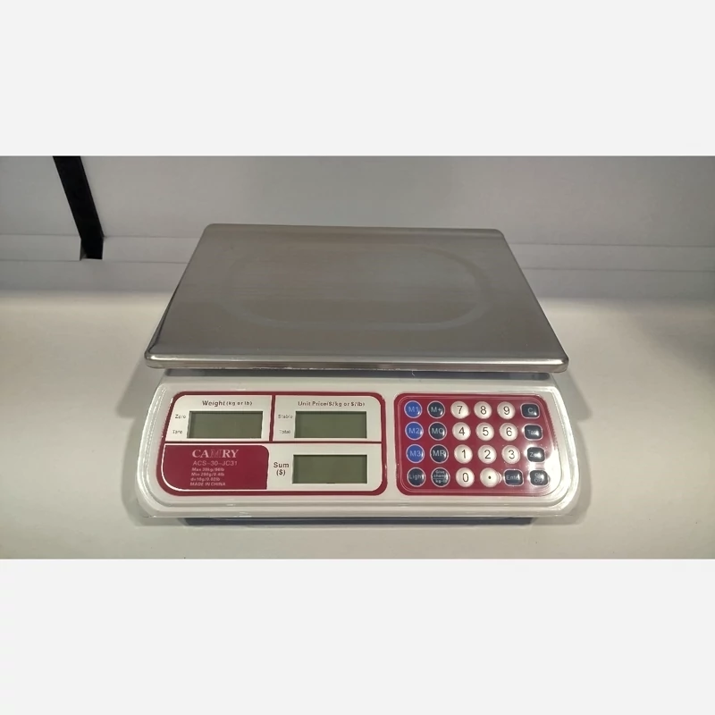 ترازو فروشگاهی اورجینال CAMRY یکی از دقیقترین ، و با کیفیت ترین ترازو های ساده فروشگاهی و تولید کارخانه اصلی CAMRY می باشد . که تنها قابلیت وزنکشی و افزودن کد محصولات را دارد این ترازو قابلیت نصب به پرینتر را نداشته و فاقد خروجی می باشد و تنها تمرکز در نوع ساخت ، همچون قطعات درجه یک بکار رفته در آن ، و دقت در اندازه گیری وزن را دارا می باشد. ترازوی فوق دارای باتری 4 ولت قابل شارژ است تا در زمان نبود برق و یا استفاده در شرایط بی برقی تا چندین ساعت قابل استفاده باشد . این ترازو دارای قیمت زن ( ماشین حساب) است و میتوان مجموع وزن اقلام را با آن محاسبه کرد و در نمایشگر مشاهده نمود . در هر دو سوی علمک ، نمایشگر LCD قرار دارد تا هم شخص فروشنده بتواند جمع قیمت و وزن محصول را مشاهده کند و هم شخصی که در سوی دیگر ترازو است .(نمایشگر دو طرفه). این ترازو دارای پایه های رگلاژ شونده در زیر است . تا توسط آنها ترازو را در مسطح ترین شرایط و در ترازترین حالت قرار دهید که عملیات وزنکشی با بالاترین دقت صورت بپذیرد . سینی ترازو از جنس استیل ضد زنگ ، و بدون لبه و با ابعاد تقریبی 33 در 20 سانتیمتر می باشد تا موجب راحتی شما در قراردادن کالا بر روی سطح آن شود . حساسیت این ترازو 1 گرم می باشد و حد اکثر ظرفیت قابل وزنکشی با آن 30 کیلو گرم است . ساختار بسیار مقاوم و متریال استفاده شده بسیار عالی در این ترازو و سرعت وزنکشی بالا و محاسبه مجموع وزن از مزایای استفاده از این ترازو است . این ترازو دارای قابلیت پارسنگ بوده ، تا به وسیله آن ( کلید ZARO و TARE) وزن سبد یا ظرفتان را صفر کنید ، و تنها وزن خالص محصول را سنجش و وزن کنید . واحد سنجش وزن در این ترازو بر مبنای کیلوگرم است .همانطور که اشاره شد ، ترازوی فوق دارای دو طرف نمایشگر و دارای نور پس زمینه بوده که وزن، قیمت واحد، قیمت کل را نشان میدهد. این ترازوی دیجیتال فروشگاهی برای میوه فروشی ها، فروشگاه مواد غذایی، قصابی ها، بازار کشاورزان و فروشگاه ها مناسب است. در آخر : نمایشگر LCD که این ترازو دارد ، خاصیت مشاهده اعداد را در نور مستقیم خورشید دارد و این وجه تمایز نمایشگر LCD با LED یا چراغ قرمز ها است .