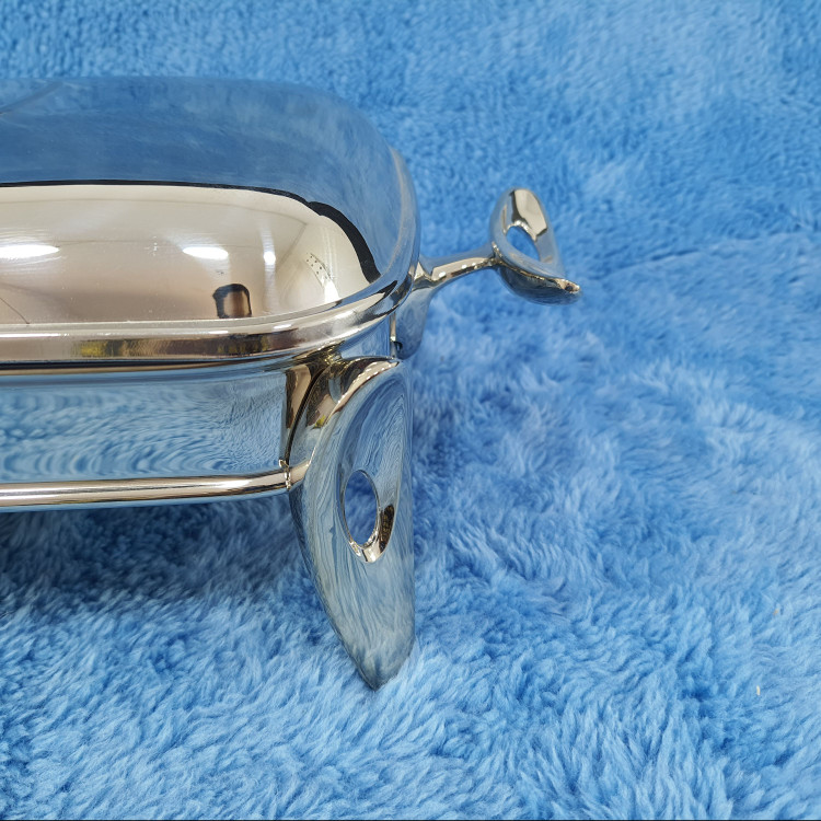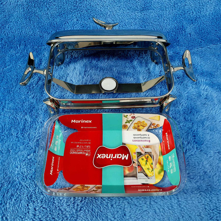 سوفله خوری کوچک مستطیل برند safinox مدل فلیم براق کد 505 تولید شده با ورق استیل ضخیم و ضد زنگ 18٫10 با پایه و دسته هایی از جنس زاماک آبکاری شده و براق و ظرف پیرکس مارینکس برزیلی 30×18 سانت 1٫6 لیتری که در مقابل شوک حرارتی و ضربه ای مقاوم است و قابلیت قرارگیری در فر و مایکروویو و ماشین ظرفشویی را دارد تولید شده