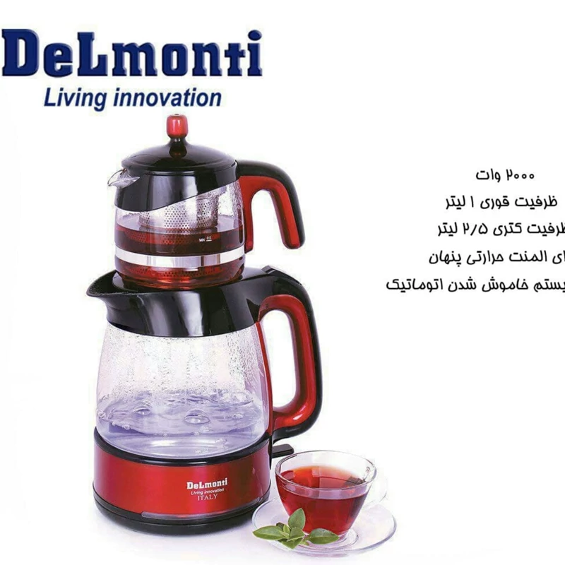 چای ساز پیرکس دلمونتی مدل DL400 از جدیدترین محصولات دلمونتی است. این چای سازاز دو بخش کتری و قوری تشکیل شده است. کتری و قوری با ظرفیت های مناسب و دستگاه دارای عملکرد گرم نگه داشتن اتوماتیک می باشد.ظرفیت کتری چای ساز در حدود 2.5 لیتر بوده و ظرفیت قوری آن در حدود 1 لیتر است و مناسب خانواده های پرجمعیت و کم جمعیت می باشد. قوری چای ساز دلمونتی مدل Dl400 از جنس شیشه میباشد که این امکان را به شما میدهد که رنگ چای دم کشیده را به راحتی تشخیص دهید، این قوری مقاوم در برابر حرارت است همچنین مجهز به فیلتر تمام استیل میباشد و کتری آن بر روی پایه دارای قابلیت چرخش 360 درجه است.