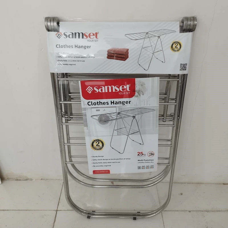 بند رخت تمام استیل سام ست محصولی محکم با تحمل وزن زیاد برای خشک کردن پالتو، لباس، کفش و ... با طول عمر بالا و کیفیت بینظیر . این بند رخت از بهترین مواد اولیه و مقاومترین لوله های استیل زد زنگ ساخته شده و حتی کوچکترین جزییات آن هم ضدزنگ هستند. عموما اکثر بند رختها پس از مدتی از ناحیه پیچ و لولا دچار زنگزدگی میشوند اما این بند رخت به هیچ عنوان زنگ نزده و تحمل وزن بسیار بالایی را دارد. بسیار سبک است برای جابجایی مشکل نخواهید داشت