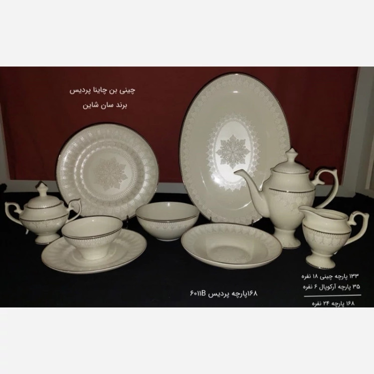 133 پارچه چینی (20 نفره) + 35 پارچه آرکوپال (6 نفره)
