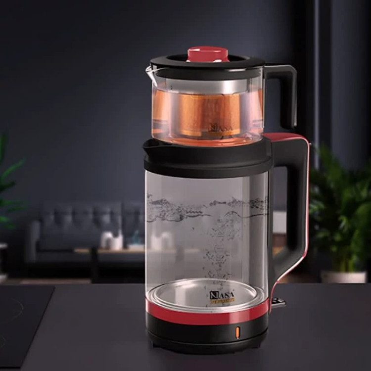 چای ساز ناسا الکتریک NS-523 یک چای ساز رو هم است و برای درست کردن چایی، قوری بر روی کتری قرار میگیرد. در واقع برای استفاده از این دستگاه کافی است کتری را پر کنید و دکمه کلیدی را به سمت پایین فشار دهید، تا آب در مدت زمانی کوتاه به جوش آید. سپس قوری را از آب جوش پر کنید و به اندازه دلخواه چای خشک داخل صافی بریزید. کتری یا همان مخزن آب در این چای ساز از جنس شیشه بروسیلیکاتی میباشد، این نوع خاص از شیشه در واقع همان شیشه پیرکس است و در ساختار آن از سیلیکات زیادی استفاده شده است. در واقع این شیشه به دلیل ضریب انبساط گرمایی پایینی که دارد در مقابل انواع شوک و استرس حرارتی مقاومت زیادی داشته و در نتیجه نسبت به شکستن نیز بسیار مقاوم میباشد. به همین دلیل در این چای ساز از شیشه بروسیلیکات استفاده شده، که بهترین نوع شیشه است